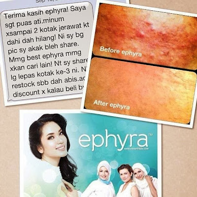 "Dulu kulit saya kusam kak, saya ni umur baru 23 tahun, tapi sbb kerja menjahit sampai lewat malam buatkan muka saya kusam tak bermaya..Tapi x sampai sebulan saya minum EPHYRA, alhamdulilah, saya lebih bertenaga, kulit mula nampak perubahan, sampai mak pun tegur katanya kulit cerah berseri2..glowing katanya..Wah, sukanya saya..thanks kak..thanks EPHYRA!"